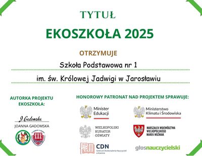 Jest nam niezmiernie miło poinformować, że Nasza Szkoła znalazła się w gronie LAUREATÓW OGÓLNOPOLSKIEGO PROJEKTU edukacyjno - ekologicznego "EKOSZKOŁA 2025". Jesteśmy jedną, ze 186 szkół z całej Polski, które uzyskały tytuł EKOSZKOŁA 2025!!